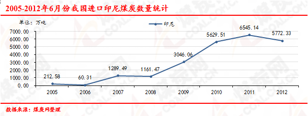 2005-2012年6月份我國(guó)進(jìn)口印尼煤炭數(shù)量走勢(shì)統(tǒng)計(jì)