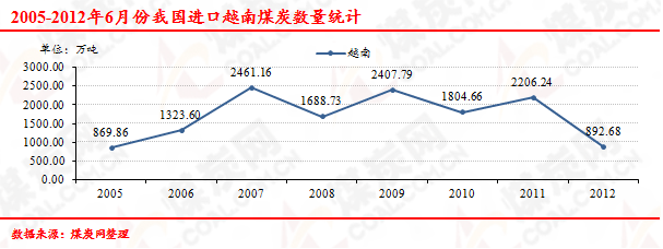2005-2012年6月份我國(guó)進(jìn)口越南煤炭數(shù)量走勢(shì)統(tǒng)計(jì)