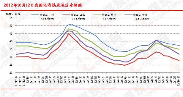 沿海運(yùn)費(fèi):截止到10月12日,現(xiàn)秦皇島港-廣州港(5-6萬(wàn)DWT)運(yùn)費(fèi)37.2元/噸,周環(huán)比下跌1元;秦皇島-福州(3-4萬(wàn)DWT)運(yùn)費(fèi)34.9元/噸,周環(huán)比下跌1.1元。天津-上海(2-3萬(wàn)DWT)運(yùn)價(jià)30.9元/噸,周環(huán)比回落1.7元;天津-鎮(zhèn)江(1-1.5萬(wàn)DWT)運(yùn)價(jià)37.6元/噸,周環(huán)比回落3元;秦皇島-寧波(1.5-2萬(wàn)DWT)運(yùn)價(jià)31.7元/噸,周環(huán)比回落2.8元。主要由于節(jié)日期間,多數(shù)交易商處于休假狀態(tài),市場(chǎng)成交較為清淡。其次下游電廠目前受天氣適宜影響休假調(diào)整,電廠日耗持續(xù)低溫運(yùn)行,影響后續(xù)電煤需求的釋放,極大的制約了拉煤的積極性。目前隨著10月8日大秦線檢修的開始,北方港口庫(kù)存開始陸續(xù)下降,部分優(yōu)質(zhì)煤種供求緊張的矛盾將繼續(xù)加劇,短期內(nèi)航運(yùn)市場(chǎng)或?qū)⒊掷m(xù)低迷。