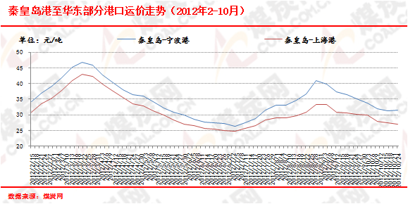 國內(nèi)沿海煤炭運(yùn)輸市場繼續(xù)保持微幅震蕩,自10月19日至10月26日,秦皇島港至寧波港(1.5-2萬噸)煤炭海運(yùn)費(fèi)微降0.3元/噸至31.2元/噸;秦皇島港至上海港(4-5萬噸)煤炭運(yùn)費(fèi)降0.4元/噸至26.8元/噸;秦皇島港至張家港(2-3萬噸)煤炭運(yùn)費(fèi)降0.6元/噸至32.3元/噸。