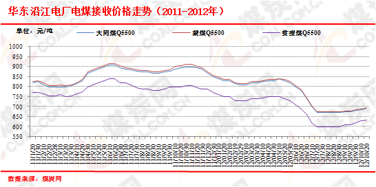 華東沿江電廠方面,最新數(shù)據(jù)顯示,2012年10月中旬,華東沿江電廠電煤接收價(jià)格較10月上旬價(jià)格整體均上漲5元/噸,(如下圖),其中,太倉華能、南通華能、上海石洞二電廠接收5000、5500、5800大卡大同煤價(jià)格分別為605元/噸、690元/噸、735元/噸;夏港電廠、揚(yáng)州二電接收5000、5500大卡蒙煤價(jià)格分別為610元/噸、695元/噸;上海石洞一、天生港電廠接收5000、5500大卡貧瘦煤價(jià)格分別為585元/噸、635元/噸。