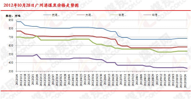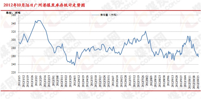 港口庫存方面:煤炭網(wǎng)信息研究中心數(shù)據(jù)顯示,截止到10月26日,廣州港存煤258.22萬噸,周環(huán)比減少19.26萬噸。其中新沙公司存煤132萬噸;周環(huán)比減少14萬噸;西基公司存煤60萬噸,周環(huán)增加2萬噸;新港公司存煤11.72萬噸,環(huán)比減少4.14萬噸;黃埔公司存煤54.49萬噸,環(huán)比減少3.13萬噸。