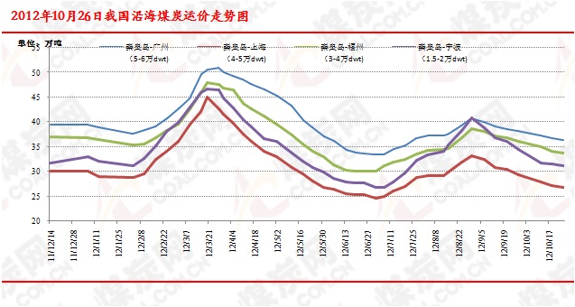 沿海運費:截止到10月26日,現(xiàn)秦皇島港-廣州港(5-6萬DWT)運費36.3元/噸,較19日下跌0.5元;秦皇島-福州(3-4萬DWT)運費33.7元/噸,下跌0.3元。天津-上海(2-3萬DWT)運價30.1元/噸,回落0.4元;天津-鎮(zhèn)江(1-1.5萬DWT)運價36.7元/噸,回落0.1元;秦皇島-寧波(1.5-2萬DWT)運價31.2元/噸,下降0.3元。截止到10月26日沿海六大電廠存煤總量為1432萬噸,周環(huán)比增加15萬噸;存煤可用天數(shù)為24.8天,較上周同期減少0.2天。電廠庫存仍居于高位。大秦線檢修結(jié)束之后,港口庫存回升,大事部分煤種仍處于缺貨狀態(tài),近期下游用煤企業(yè)派船拉煤的積極性出現(xiàn)下降態(tài)勢,其中秦皇島港錨地船舶數(shù)量已經(jīng)下降至92艘左右。于此同時國際煤炭市場的進(jìn)一步下挫也對國內(nèi)煤炭市場繼續(xù)施加壓力。綜合分析認(rèn)為,國內(nèi)航運市場運輸需求低迷,租船成交清淡,煤炭海運費持續(xù)下探,受船運成本因素控制,海運費進(jìn)一步下跌的空間有限,各航線煤炭運價或?qū)⑦M(jìn)入窄幅震蕩階段。