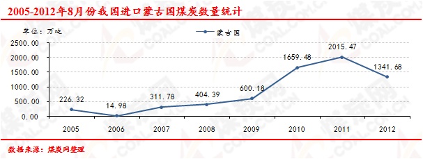 2005-2012年8月份我國進口蒙古煤炭數(shù)量走勢統(tǒng)計