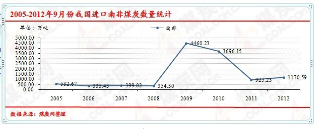 2005-2012年9月份我國進口南非煤炭數(shù)量走勢統(tǒng)計