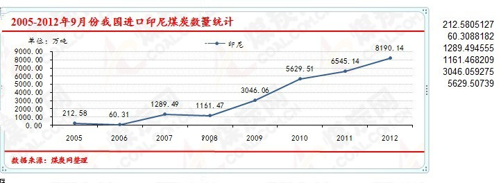 2005-2012年9月份我國(guó)進(jìn)口印尼煤炭數(shù)量走勢(shì)統(tǒng)計(jì)
