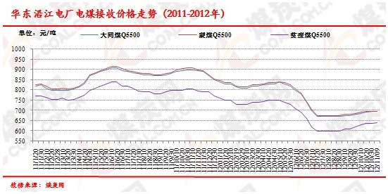 電廠發(fā)電量和日耗煤量有所下降。受經(jīng)濟(jì)形勢(shì)的影響,鎮(zhèn)海電廠今年的發(fā)電量和日耗煤量均呈現(xiàn)下降的態(tài)勢(shì)。1-10月該廠共發(fā)電37.7億度,比去年同期減少8.3億度。10月份該廠共耗煤10.6萬(wàn)噸,同比減少0.6萬(wàn)噸。1-10月份共耗煤113.8萬(wàn)噸,同比減少27.2萬(wàn)噸。據(jù)浙能集團(tuán)統(tǒng)計(jì),10月份日均耗煤量為10.3萬(wàn)噸,同減0.8萬(wàn)噸。當(dāng)前浙能系統(tǒng)存煤量達(dá)388萬(wàn)噸,同比增長(zhǎng)60萬(wàn)噸,仍處于較高水平。最新數(shù)據(jù)顯示,2012年11月上旬,太倉(cāng)華能、南通華能、上海石洞二電廠接收5000、5500、5800大卡大同煤價(jià)格分別為605元/噸、690元/噸、735元/噸;夏港電廠、揚(yáng)州二電接收5000、5500大卡蒙煤價(jià)格分別為610元/噸、695元/噸。上海石洞一廠、南通天生港電廠接收5000、5500大卡貧瘦煤價(jià)格分別為590元/噸、640元/噸,較上一期均上漲5元。