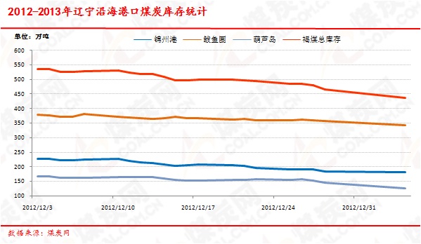 截止到2013年1月4日,北方三港褐煤總庫存為436萬噸,較24日下降58萬噸。其中錦州港存煤182萬噸,下降15萬噸;鲅魚圈港存煤344萬噸,下降16萬噸;葫蘆島存煤126萬噸,下降32萬噸。近期受極寒天氣因素影響,錦州港及周邊港口成交情況出現(xiàn)小幅回暖情況,港口存煤繼續(xù)從高位回落,需求出現(xiàn)回升跡象,但是褐煤成交價(jià)格則繼續(xù)弱勢下滑。