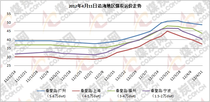 煤炭網(wǎng)信息研究中心數(shù)據(jù)顯示:截止到4月11日,秦皇島至廣州(5-6萬DWT)運價48.6元/噸,較30日下跌1.5元/;秦皇島至福州(3-4萬DWT)運價43.8元/噸,較30日下跌3.1元;秦皇島至張家港(2-3萬DWT)運價41.9元/噸,較30日下跌4.2元;天津港至上海(2-3萬DWT)運價39.2元/噸,較30日下跌4.2元。
