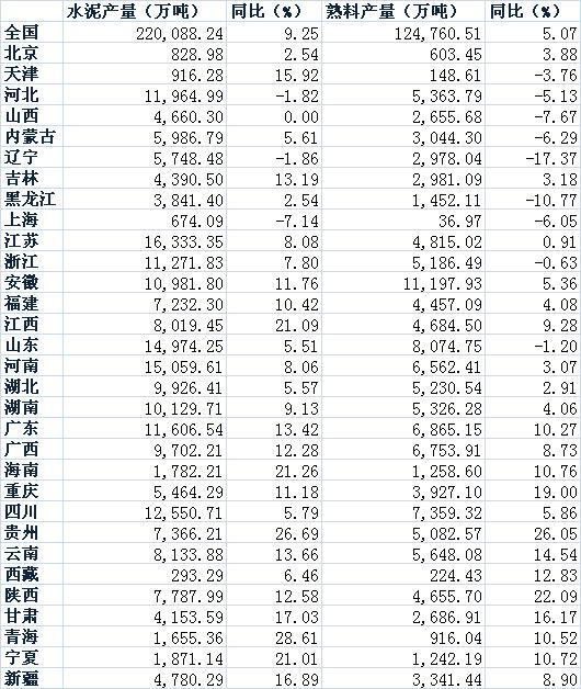 2013年1-11月全國各地水泥產(chǎn)量統(tǒng)計