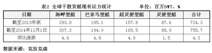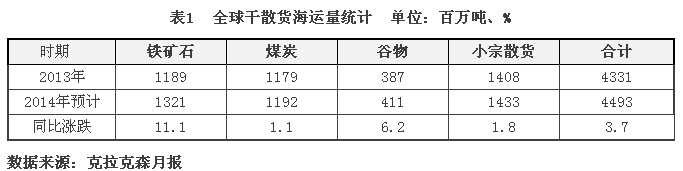 今年全球經(jīng)濟(jì)復(fù)蘇仍將是脆弱和不平衡的。烏克蘭地緣政治危機(jī)將對(duì)歐洲經(jīng)濟(jì)造成沖擊,國(guó)際油價(jià)大幅回落,俄羅斯經(jīng)濟(jì)也面臨下行壓力。國(guó)際貨幣基金組織預(yù)計(jì)今年全球經(jīng)濟(jì)增速為3.8%,國(guó)際干散貨海運(yùn)貿(mào)易量增幅繼續(xù)收窄。克拉克森預(yù)計(jì),今年全球干散貨海運(yùn)量為46.59億噸,同比增長(zhǎng)3.7%(見(jiàn)表3)。