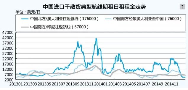 去年海岬型船市場(chǎng)運(yùn)價(jià)呈波浪式震蕩,振幅縮小。全年走出三波上漲行情,上半年在礦商加快出貨步伐以及市場(chǎng)炒作影響下,一改2013年低位平穩(wěn)運(yùn)行走勢(shì),2月下旬至3月下旬海岬型船日租金大幅上漲。下半年,鐵礦石價(jià)格持續(xù)下跌,8月中旬至9月中旬、10月下旬至11月中旬,鐵礦石船運(yùn)活動(dòng)升溫,與2013年一樣走出兩輪上漲行情,但上漲幅度小,持續(xù)時(shí)間短。隨著國(guó)際油價(jià)大幅回落,中國(guó)經(jīng)濟(jì)放緩,海岬型船提早進(jìn)入低迷慘淡行情,日租金跌至2013年以來(lái)最低。去年年底,中國(guó)北方至澳大利亞往返航線日租金為4050美元,較年初下跌85.9%;全年平均13138美元,同比下跌9.3%。