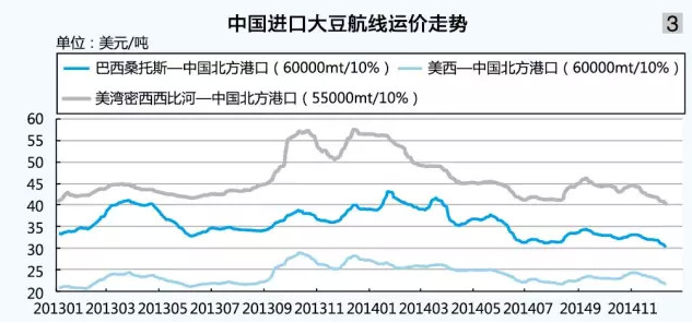 糧食航線:上半年,南美二季度糧食出口季節(jié),市場(chǎng)運(yùn)價(jià)尚能同比持平,但下半年,煤炭船運(yùn)減少,大西洋市場(chǎng)運(yùn)力增加,油價(jià)下滑,美灣至中國(guó)北方港口糧食運(yùn)價(jià)同比明顯下降。去年年底,巴西桑托斯至中國(guó)北方港口大豆航線運(yùn)價(jià)為26.740美元/噸,較年初下跌31.5%,全年平均34.896美元/噸,同比下跌4.4%;美灣至中國(guó)北方港口航線運(yùn)價(jià)為35.811美元/噸,較年初下跌36.8%,全年平均45.293美元/噸,同比下跌2.7%(見(jiàn)圖3)。