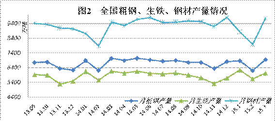 2015年3月,全國共生產(chǎn)粗鋼6948.49萬噸、生鐵6024.75萬噸、鋼材9755.88萬噸,其中納入中國鋼鐵工業(yè)協(xié)會月報統(tǒng)計的會員鋼鐵企業(yè)共生產(chǎn)粗鋼5205.56萬噸、生鐵5262.93萬噸、鋼材5105.21萬噸,分別占全國粗鋼產(chǎn)量的74.92%、全國生鐵產(chǎn)量的87.36%、全國鋼材產(chǎn)量的52.33%。