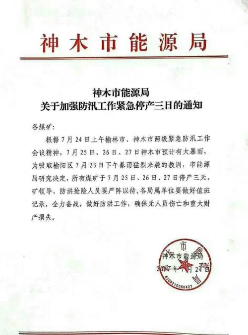 為吸取榆陽區(qū)7月23日下午暴雨猛烈來襲的教訓(xùn),神木市能源局絕對(duì)市內(nèi)所有煤礦于7月25-27日三天緊急停產(chǎn)。具體文件如下:
