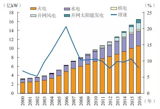 圖1 2000—2016年中國發(fā)電總裝機容量及其增速變化