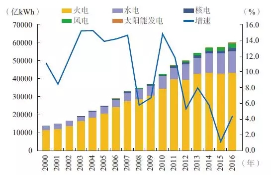 圖2 2000—2016 年中國發(fā)電總量及增速變化