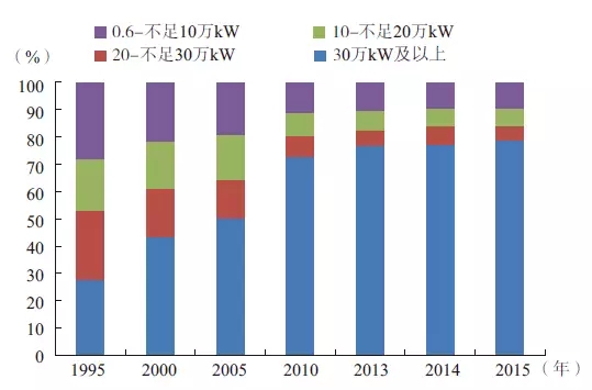 以大機組替代小機組,煤電結構進一步優(yōu)化!笆晃濉睍r期以來累計關停小火電約1.1億kW,30萬kW及以上火電機組比例由1995年的27.8%提高至2015的年85.1%。汽輪機組容量等級變化情況見圖3。