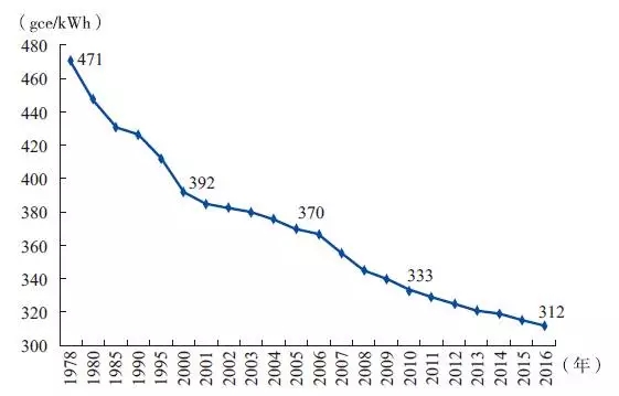 通過結構調整、技術創(chuàng)新、科學管理等多方面的措施,2016年,全國6000kW及以上火電機組供電煤耗312gce/kWh,比1978年的471gce/kWh下降了159gce/kWh,降幅達到33.8%。1978—2016年火電供電煤耗下降情況見圖4。