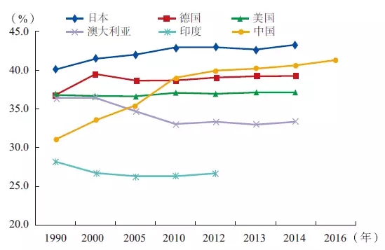 由于中國火電長期以煤電為主,2015年火電發(fā)電量中92%為燃煤機組發(fā)電,因此火電廠平均效率基本上代表了燃煤電廠的平均效率。與世界其他主要燃煤發(fā)電國家平均效率相比,日本煤電機組效率最高,2014年達到43.3%,中國煤電發(fā)電效率目前僅略低于日本(我國2014年為40.6%,2016年提高至41.4%),高于德國、美國等其他國家。在此特別指出的是,煤電的負荷對機組煤耗影響很大,如根據國標GB21258—2013,當負荷降低10%時,對煤耗影響在3~5gce/kWh。日本的核電機組帶基本負荷,燃煤機組帶基本負荷和中間負荷,燃油及燃氣機組帶中間負荷和尖峰負荷,抽水蓄能、部分氣電機組等帶尖峰負荷,實際上日本的大容量機組一般都是滿負荷發(fā)電,而我國30萬kW及以上機組多數負荷率在60%~75%。如考慮負荷因素對效率降低的作用,我國燃煤電廠的效率將與日本持平。部分國家煤電發(fā)電效率變化情況見圖5。