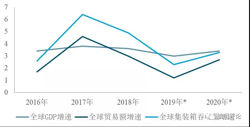 注:*表由IMF、WTO、Drewry官網(wǎng)預(yù)測數(shù)據(jù)來源:IMF、WTO、Drewry官網(wǎng)圖1 2016年-2019年全球GDP增速、全球貿(mào)易額增速、全球集裝箱吞吐量增速