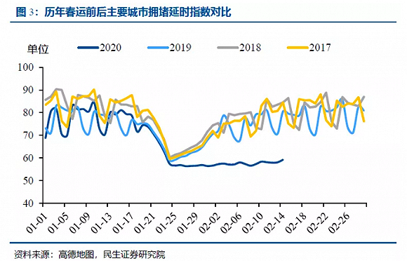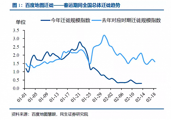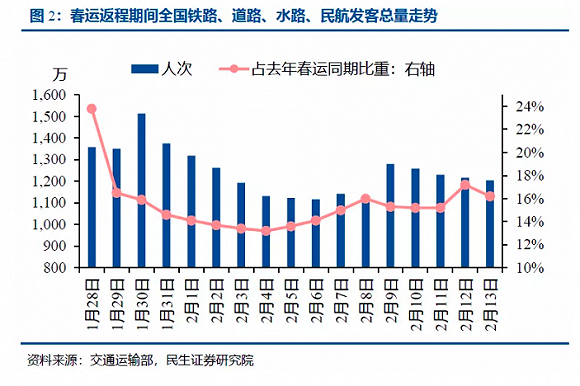 民生宏觀在日前發(fā)布的一份研報中從包括全國春運遷移指數(shù)、全國鐵路、道路、水路、民航發(fā)客總量在內(nèi)的六個角度分析了當前的復工進度。