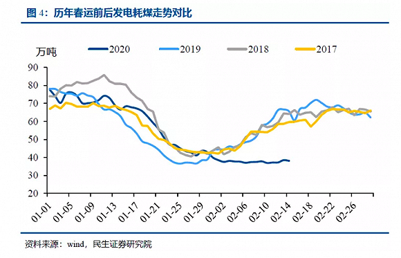 大年初九以來發(fā)電耗煤量明顯低于往年同期。根據(jù)6大發(fā)電集團發(fā)電耗煤量走勢,今年春節(jié)第二周以來,日均發(fā)電耗煤量明顯低于往年春節(jié)同期,至今沒有向上趨勢。發(fā)電耗煤量走勢反映工業(yè)生產(chǎn)情況,發(fā)電耗煤量持續(xù)低迷體現(xiàn)出工業(yè)領域復工率較低的事實。