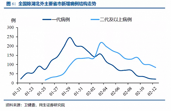 非湖北地區(qū)二代以上病例占比在提升,復工后防疫壓力較大。對全國主要省市而言,隨著自春節(jié)以來14天隔離期結(jié)束,非湖北地區(qū)新增一代病例(湖北輸入型病例)逐漸下降,但新增二代以上病例占比逐漸增多,成為新增病例主要來源。說明新冠肺炎在全國非湖北地區(qū)有二次傳播的現(xiàn)象。