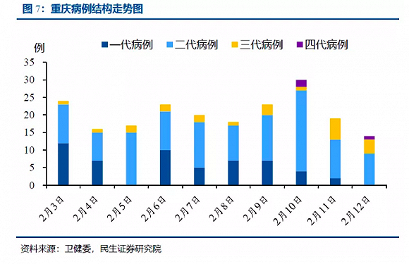 很多城市出現(xiàn)三代甚至四代病例,防疫責任仍然較大。包括重慶、溫州等多個城市均出現(xiàn)一定規(guī)模的三代甚至四代病例,這意味著這些城市疫情出現(xiàn)多輪傳播,且二代以上病例傳播路徑追蹤較為困難,地方仍然承擔著較大的防疫責任和壓力。