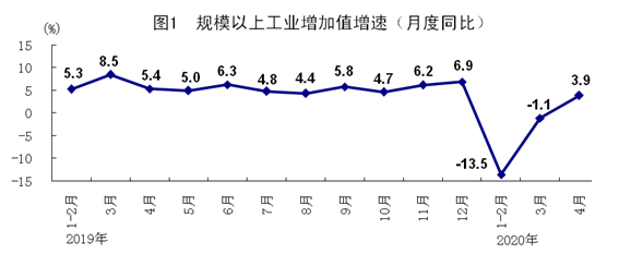 4月份,全國(guó)規(guī)模以上工業(yè)增加值同比增長(zhǎng)3.9%,3月份為下降1.1%;環(huán)比增長(zhǎng)2.27%。1-4月份,全國(guó)規(guī)模以上工業(yè)增加值同比下降4.9%,降幅比1-3月份收窄3.5個(gè)百分點(diǎn)。4月份,分經(jīng)濟(jì)類型看,國(guó)有控股企業(yè)增加值增長(zhǎng)0.5%;股份制企業(yè)增長(zhǎng)4.0%,外商及港澳臺(tái)商投資企業(yè)增長(zhǎng)3.9%;私營(yíng)企業(yè)增長(zhǎng)7.0%。分三大門類看,采礦業(yè)增加值增長(zhǎng)0.3%;制造業(yè)增長(zhǎng)5.0%,3月份為下降1.8%;電力、熱力、燃?xì)饧八a(chǎn)和供應(yīng)業(yè)增長(zhǎng)0.2%。高技術(shù)制造業(yè)和裝備制造業(yè)增長(zhǎng)較快。4月份,高技術(shù)制造業(yè)和裝備制造業(yè)增加值分別增長(zhǎng)10.5%和9.3%,快于規(guī)模以上工業(yè)6.6和5.4個(gè)百分點(diǎn)。從產(chǎn)品產(chǎn)量看,光纜,挖掘、鏟土運(yùn)輸機(jī)械,集成電路,工業(yè)機(jī)器人,微型計(jì)算機(jī)設(shè)備產(chǎn)量同比分別增長(zhǎng)43.8%、40.8%、29.2%、26.6%、26.2%。