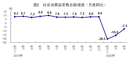 4月份,社會(huì)消費(fèi)品零售總額28178億元,同比下降7.5%,降幅比3月份收窄8.3個(gè)百分點(diǎn);環(huán)比增長(zhǎng)0.32%。1-4月份,社會(huì)消費(fèi)品零售總額106758億元,同比下降16.2%,降幅比1-3月份收窄2.8個(gè)百分點(diǎn)。4月份,按經(jīng)營(yíng)單位所在地分,城鎮(zhèn)消費(fèi)品零售額24558億元,同比下降7.5%;鄉(xiāng)村消費(fèi)品零售額3620億元,下降7.7%。按消費(fèi)類型分,餐飲收入2307億元,下降31.1%;商品零售25871億元,下降4.6%;旧铑惿唐份^快增長(zhǎng),4月份,限額以上單位商品零售額中,糧油食品類和飲料類同比分別增長(zhǎng)18.2%和12.9%。消費(fèi)升級(jí)類商品銷售改善,4月份,通訊器材類和文化辦公用品類分別增長(zhǎng)12.2%和6.5%,比3月份分別加快5.7和0.4個(gè)百分點(diǎn)。網(wǎng)上零售較為活躍,1-4月份,全國(guó)網(wǎng)上零售額30698億元,同比增長(zhǎng)1.7%,1-3月份為下降0.8%;其中,實(shí)物商品網(wǎng)上零售額增長(zhǎng)8.6%,比1-3月份加快2.7個(gè)百分點(diǎn),占社會(huì)消費(fèi)品零售總額的比重為24.1%,比1-3月份提高0.5個(gè)百分點(diǎn)。