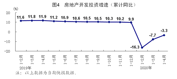 1-4月份,全國(guó)固定資產(chǎn)投資(不含農(nóng)戶)136824億元,同比下降10.3%,降幅比1-3月份收窄5.8個(gè)百分點(diǎn);4月份環(huán)比增長(zhǎng)6.19%。分領(lǐng)域看,基礎(chǔ)設(shè)施投資同比下降11.8%,制造業(yè)投資下降18.8%,房地產(chǎn)開發(fā)投資下降3.3%,降幅分別比1-3月份收窄7.9、6.4、4.4個(gè)百分點(diǎn)。全國(guó)商品房銷售面積33973萬平方米,下降19.3%;商品房銷售額31863億元,下降18.6%,降幅分別比1-3月份收窄7.0和6.1個(gè)百分點(diǎn)。分產(chǎn)業(yè)看,第一產(chǎn)業(yè)投資下降5.4%,第二產(chǎn)業(yè)投資下降16.0%,第三產(chǎn)業(yè)投資下降7.8%,降幅分別比1-3月份收窄8.4、5.9、5.7個(gè)百分點(diǎn)。高技術(shù)產(chǎn)業(yè)投資下降3.0%,降幅小于全部投資7.3個(gè)百分點(diǎn),比1-3月份收窄9.1個(gè)百分點(diǎn);其中,高技術(shù)制造業(yè)和高技術(shù)服務(wù)業(yè)投資分別下降3.6%和1.7%。高技術(shù)制造業(yè)中,計(jì)算機(jī)及辦公設(shè)備制造投資增長(zhǎng)15.4%。高技術(shù)服務(wù)業(yè)中,科技成果轉(zhuǎn)化服務(wù)、電子商務(wù)服務(wù)、專業(yè)技術(shù)服務(wù)投資分別增長(zhǎng)28.0%、25.6%、12.5%。社會(huì)領(lǐng)域投資下降3.1%,比1-3月份收窄5.7個(gè)百分點(diǎn);其中,衛(wèi)生、教育領(lǐng)域投資同比增速由負(fù)轉(zhuǎn)正,分別增長(zhǎng)4.7%、2.9%。