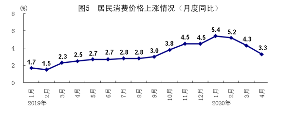 4月份,全國(guó)居民消費(fèi)價(jià)格同比上漲3.3%,漲幅比3月份回落1.0個(gè)百分點(diǎn);環(huán)比下降0.9%。1-4月份,全國(guó)居民消費(fèi)價(jià)格同比上漲4.5%。分類別看,4月份,食品煙酒價(jià)格同比上漲11.3%,衣著下降0.4%,居住下降0.3%,生活用品及服務(wù)上漲0.1%,交通和通信下降4.9%,教育文化和娛樂上漲2.0%,醫(yī)療保健上漲2.2%,其他用品和服務(wù)上漲4.8%。在食品煙酒價(jià)格中,糧食上漲1.2%,鮮菜下降3.7%,豬肉上漲96.9%,鮮果下降10.5%?鄢称泛湍茉磧r(jià)格后的核心CPI上漲1.1%,漲幅比3月份回落0.1個(gè)百分點(diǎn)。