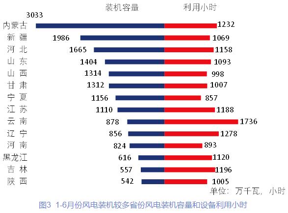 分類型看,1-6月份,全國水電設備平均利用小時為1528小時,比上年同期降低145小時。在水電裝機容量排前10的省份中,除青海和湖北外,其他省份水電設備平均利用小時均同比降低,其中,福建、云南、廣西、浙江、湖南和廣東同比降低超過200小時,分別降低570、396、287、263、257和204小時;全國火電設備平均利用小時為1947小時(其中,燃煤發(fā)電和燃氣發(fā)電設備平均利用小時分別為1994和1196小時),比上年同期降低119小時。分省份看,全國共有11個省份火電設備利用小時超過全國平均水平,其中內蒙古和甘肅超過2300小時,分別為2449和2356小時,而西藏僅為162小時。與上年同期相比,共有23個省份火電利用小時同比降低,其中湖北、海南、河北、安徽、山東、江蘇和浙江同比降低超過200小時,分別降低492、352、327、272、264、219和211小時,河南、貴州、陜西、山西、天津、重慶、寧夏和內蒙古同比降低超過100小時,而云南、廣西、甘肅、四川和新疆同比增加超100小時,分別增加833、281、210、118和113小時;全國核電設備平均利用小時3519小時,比上年同期增加90小時;全國并網風電設備平均利用小時1123小時,比上年同期降低10小時;全國太陽能發(fā)電設備平均利用小時663小時,比上年同期增加13小時。