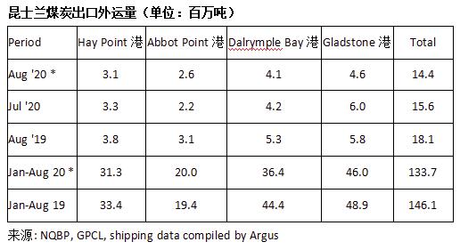 據(jù)阿格斯(Argus)整理的澳大利亞昆士蘭州港口煤炭外運出口數(shù)據(jù)顯示,2020年8月,昆士蘭州煤炭出口1440萬噸,比7月份的1562萬噸減少7.7%,比2019年8月份的1806萬噸下降20%。1-8月,昆士蘭州煤炭出口1.34億噸,比2019年同期的1.46億噸減少1240萬噸,同比下降8.5%。