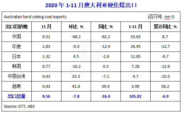 據(jù)阿格斯(Argus)援引澳大利亞統(tǒng)計(jì)局(Australian Bureau of Statistics —ABS)發(fā)布的初步統(tǒng)計(jì)數(shù)據(jù)顯示,2020年11月,澳大利亞冶金煤(metallurgical coal,包括硬焦煤hard coking coal,半軟焦煤semi-soft coking coal 和噴吹煤pulverised coal injection—PCI)出口量為1337萬(wàn)噸,比10月份的1365萬(wàn)噸下降2.1%,比上年同期的1514萬(wàn)噸下降11.7%。