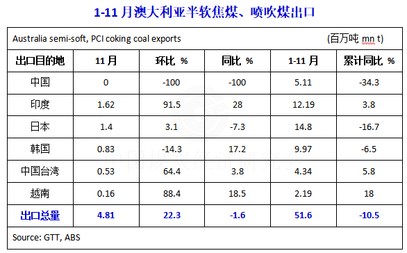 1-11月份澳大利亞半軟焦煤、噴吹煤合計(jì)出口5160萬(wàn)噸,比上年同期下降10.5%。其中出口中國(guó)511萬(wàn)噸,同比下降34.3%,11月出口中國(guó)的半軟焦煤和噴吹煤為零;同期,出口印度1219萬(wàn)噸,同比增長(zhǎng)3.8%,出口日本1480萬(wàn)噸,同比下降16.7%;出口韓國(guó)997萬(wàn)噸,同比下降6.5%;出口我國(guó)臺(tái)灣省434萬(wàn)噸,同比增長(zhǎng)5.8%,出口越南219萬(wàn)噸,同比增長(zhǎng)18%。