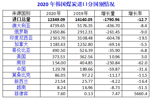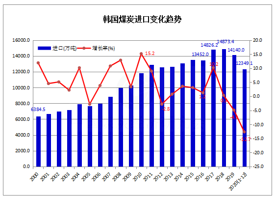 據(jù)韓國(guó)海關(guān)(Korea Customs Service -KCS)發(fā)布的統(tǒng)計(jì)數(shù)據(jù),2020年1-12月韓國(guó)煤炭進(jìn)口12349.1萬(wàn)噸,同比減少1791萬(wàn)噸,下降12.7%。