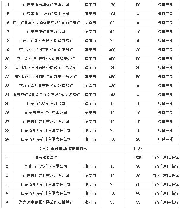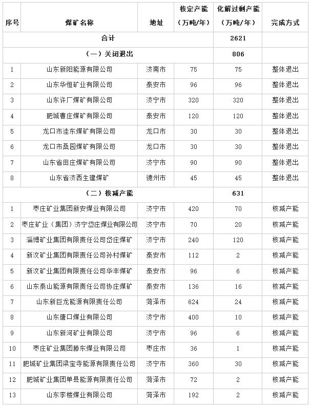 山東省2020年煤炭化解過(guò)剩產(chǎn)能完成情況表
