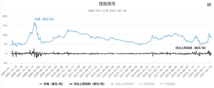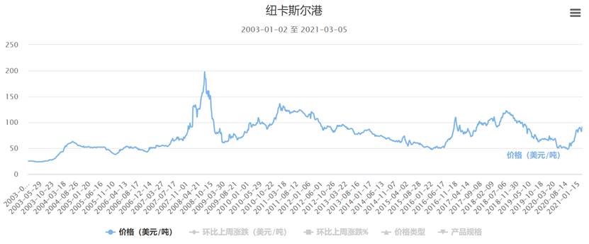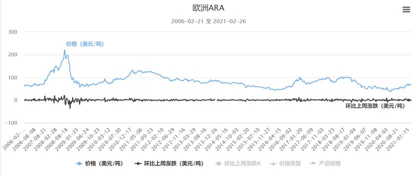 據(jù)globalCOAL交易平臺(tái)數(shù)據(jù)顯示,截至2021年3月5日當(dāng)周,紐卡斯?fàn)柛、南非理查茲灣港?dòng)力煤價(jià)格較前一周大幅上漲,創(chuàng)2019年3月份以來新高,而歐洲ARA三港動(dòng)力煤價(jià)格小幅下降。