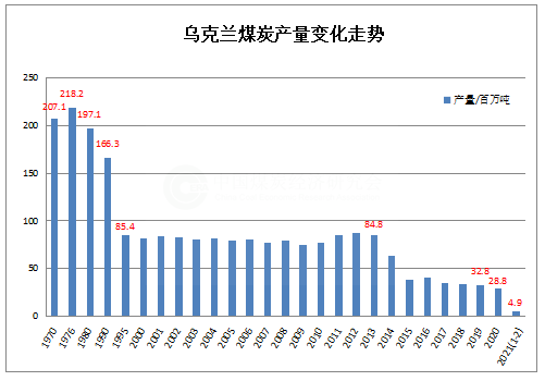 據(jù)烏克蘭能源與煤炭工業(yè)部(Energy and Coal Industry Ministry)數(shù)據(jù)顯示,2020年,烏克蘭煤炭產量為2881.8萬噸,比2019年的3122.44萬噸減少減少240.6萬噸,同比下降7.7%。