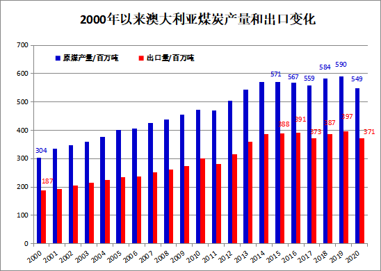 據(jù)澳大利亞聯(lián)邦工業(yè)、科學、能源和資源部(Department of Industry, Science,Energy and Resources) 發(fā)布的2021年一季度《資源和能源季報》(Resources and Energy Quarterly,March 2021)數(shù)據(jù)顯示,2020年,澳大利亞原煤(Black coal, raw)產(chǎn)量5.49億噸(不含褐煤),比上年減少4125萬噸,下降7.0%;可銷售商品煤產(chǎn)量(Black, saleable)4.34億噸,比上年減少2919萬噸,下降6.3%。