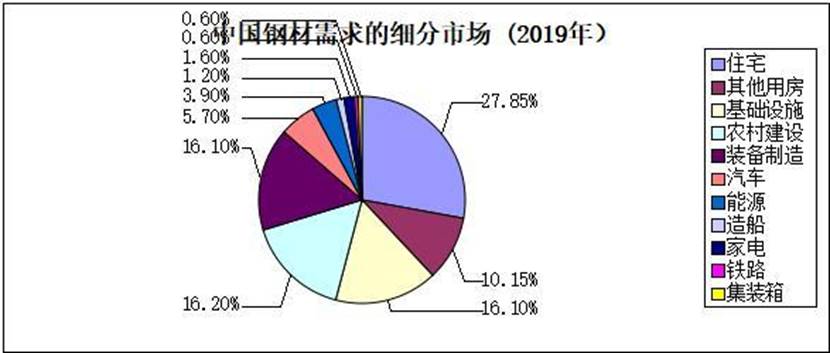 中國人追求擁有自有住房的傳統(tǒng)和在資產(chǎn)配置中偏好不動產(chǎn)的觀念,使房產(chǎn)在中國供人居住外,也成為一種流行的投資品。中國的城市化進程和房產(chǎn)在中國的投資屬性,共同助推了房地產(chǎn)業(yè)成為目前中國最大的用鋼領(lǐng)域。2019年房地產(chǎn)建設(shè)占中國用鋼量的38%,其中住宅建設(shè)用鋼占28%,其他用房建設(shè)占10%。