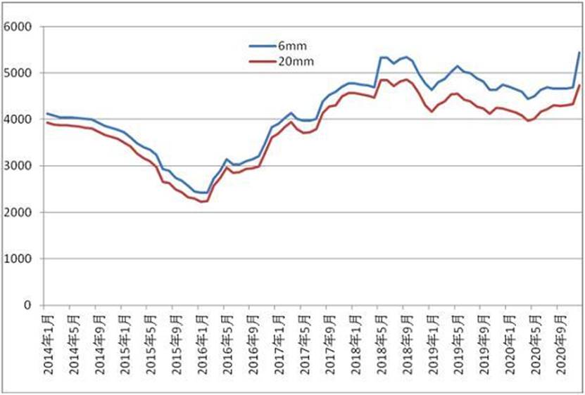 中國造船板月均價格走勢(2014-2020),數(shù)據(jù)來源:中國鋼鐵協(xié)會