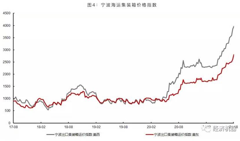 隨著國外主要經(jīng)濟體經(jīng)濟的復蘇和疫情的反復,全球進口依舊旺盛,從高頻的集裝箱出口運價指數(shù)看,9月寧波出口集裝箱運價指數(shù)繼續(xù)上行,表明出口依然面臨有力支撐(圖:4)。