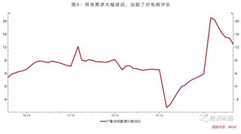 在出口和工業(yè)生產(chǎn)高景氣下,我國發(fā)電量也呈現(xiàn)明顯的V形反彈的態(tài)勢,發(fā)電量累計同比增速從2020年最低的-8%,快速攀升至今年初最高的19.5%,至今仍有11.3%的漲幅(圖5)。用電需求的暴跌和暴漲,既加劇了動力煤價格的暴漲,也加劇了對電網(wǎng)的沖擊,使電力階段性短缺具有一定必然性。