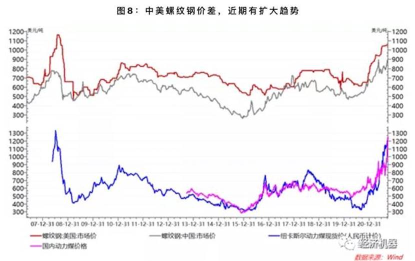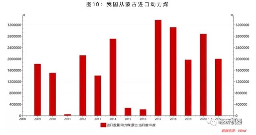 疫情。疫情對供給的沖擊體現(xiàn)在多個方面。一方面,由于供應鏈的破壞,導致海外大宗商品漲幅比國內更大,加劇了抑制大宗商品價格工作的難度,因為一旦國內打壓得厲害,企業(yè)就會通過出口進行套利(圖8)。比如美國螺紋鋼價格超過了國內,而且價差有擴大趨勢;再比如,紐卡斯爾動力煤價格超過180美元/噸,合人民幣突破1200/噸。另一方面,由于人流、物流和貨船短缺等限制,我國自海外進口大宗商品也受到一定影響。比如1~8月份,我國從蒙古進口動力煤僅110萬噸,比去年同期下降20%,如果四季度不能如期出現(xiàn)放量,那么全年進口將大幅下降(圖10)。