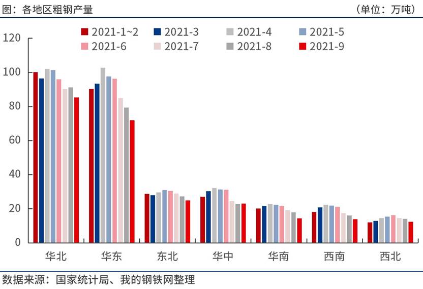 2021年9月份,華北、華東、東北、華南、西南、西北等地區(qū)粗鋼日均產(chǎn)量85.3萬噸、72.0萬噸、24.8萬噸、14.4萬噸、13.8萬噸和12.4萬噸,分別較上月減少5.9萬噸、7.4萬噸、2.4萬噸、3.5萬噸、2.2萬噸和1.5萬噸;華中地區(qū)粗鋼日均產(chǎn)量23.1萬噸,較上月增加0.2萬噸。