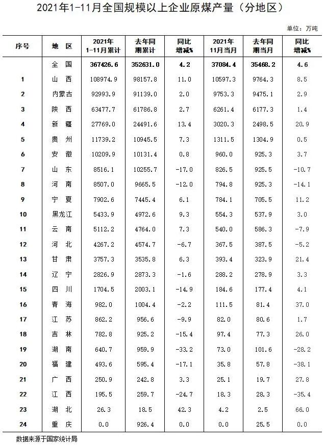 國(guó)家統(tǒng)計(jì)局?jǐn)?shù)據(jù)顯示,2021年11月全國(guó)規(guī)模以上企業(yè)原煤產(chǎn)量37084.4萬(wàn)噸,同比增長(zhǎng)4.6%;1—11月累計(jì)產(chǎn)量367426.6萬(wàn)噸,同比增長(zhǎng)4.2%。