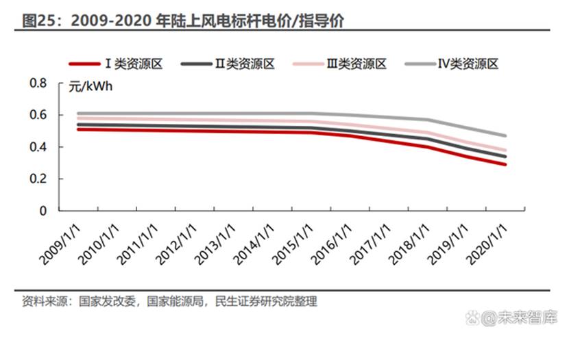 風(fēng)電上網(wǎng)電價(jià)的標(biāo)桿化始于 2009 年,當(dāng)年 7 月 20 日,國家發(fā)改委發(fā)布《關(guān) 于完善風(fēng)力發(fā)電上網(wǎng)電價(jià)政策的通知》(發(fā)改價(jià)格[2009]1906 號(hào)),按風(fēng)能資源狀況和工程建設(shè)條件,將全國分為Ⅰ-Ⅳ四類風(fēng)能資源區(qū),相應(yīng)標(biāo)桿上網(wǎng)電價(jià)分別為 0.51、0.54、0.58、0.61 元/千瓦時(shí)。2014 年 6 月 5 日,發(fā)改委發(fā)布了《關(guān)于海上風(fēng)電上網(wǎng)電價(jià)政策的通知》(發(fā)改價(jià)格[2014]1216 號(hào)),對當(dāng)時(shí)尚未開始大規(guī)模 發(fā)展的海上風(fēng)電,制定了標(biāo)桿上網(wǎng)電價(jià)。通知規(guī)定,2017年以前投運(yùn)的近海風(fēng)電 項(xiàng)目上網(wǎng)電價(jià)為 0.85 元/千瓦時(shí),潮間帶風(fēng)電項(xiàng)目上網(wǎng)電價(jià)為 0.75 元/千瓦時(shí)。 在執(zhí)行了 5 年后,風(fēng)電標(biāo)桿電價(jià)迎來首次下調(diào),2014 年底公布的《關(guān)于適當(dāng) 調(diào)整陸上風(fēng)電標(biāo)桿上網(wǎng)電價(jià)的通知》(發(fā)改價(jià)格[2014]3008 號(hào))將第 I 類、II 類和 III類資源區(qū)風(fēng)電標(biāo)桿上網(wǎng)電價(jià)降低 2 分/千瓦時(shí)。一年后,《關(guān)于完善陸上風(fēng)電光伏發(fā)電上網(wǎng)標(biāo)桿電價(jià)政策的通知》(發(fā)改價(jià)格[2015]3044 號(hào))公布,再次將I、II、 III類資源區(qū)風(fēng)電標(biāo)桿上網(wǎng)電價(jià)降低 2 分/千瓦時(shí),Ⅳ類資源區(qū)降低 1 分/千瓦時(shí)。 通知同時(shí)提前設(shè)定了2018 年起的風(fēng)電標(biāo)桿電價(jià),但又是在一年后,2016 年 12 月 26 日發(fā)布的《關(guān)于調(diào)整光伏發(fā)電陸上風(fēng)電標(biāo)桿上網(wǎng)電價(jià)的通知》(發(fā)改價(jià)格 [2016]2729 號(hào)),大幅下調(diào) 2018 年起的風(fēng)電標(biāo)桿上網(wǎng)電價(jià),Ⅰ-Ⅳ四類資源區(qū)的 電價(jià)相比 2016-2017 年分別降低了 7、5、5、3 分/千瓦時(shí)。